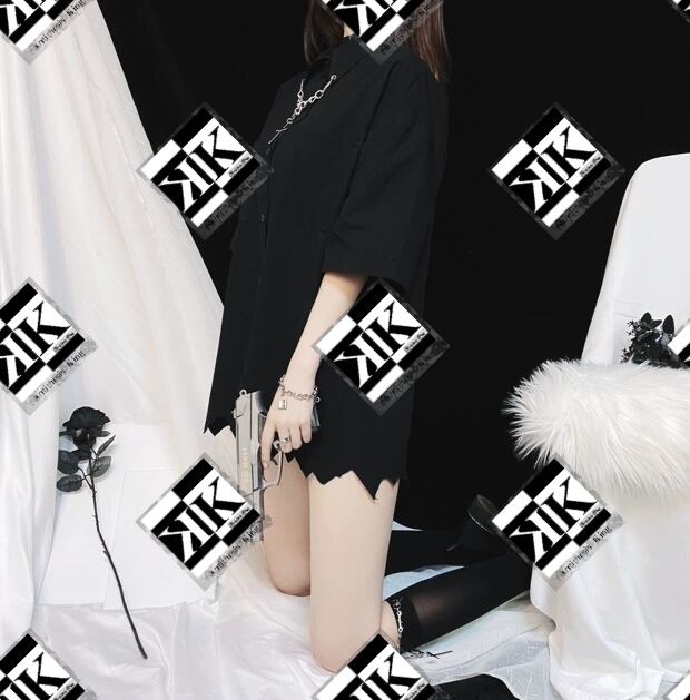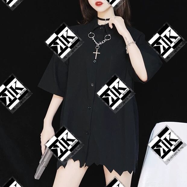 【ATK.LADY】旧A85 チェストチェーン ギザギザ ヘム ルーズ ブラック 黒 ワイシャツ 山本系 クールビューティ ユニセックス かっこかわいい かっこいい 裾 レディース シャツ ハロウィン 半袖 黒 暗黒 小悪魔 ビジュアル ダンス 演出