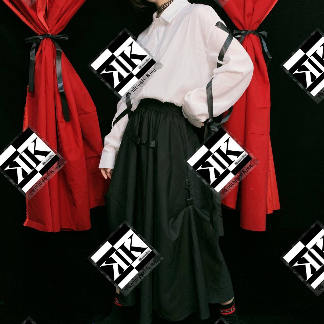 【ATK.LADY】B35 レースアップ ホワイト 白 ワイシャツ裾広め 不規則裾 ヘム 山本系 ストリート系 モード系 かっこいい クールビューティ ミモレ丈 ブラック レディース ロングスカート ロック クール 原宿 デザイン 非対称 韓国 ダンス 演出 ストリート系