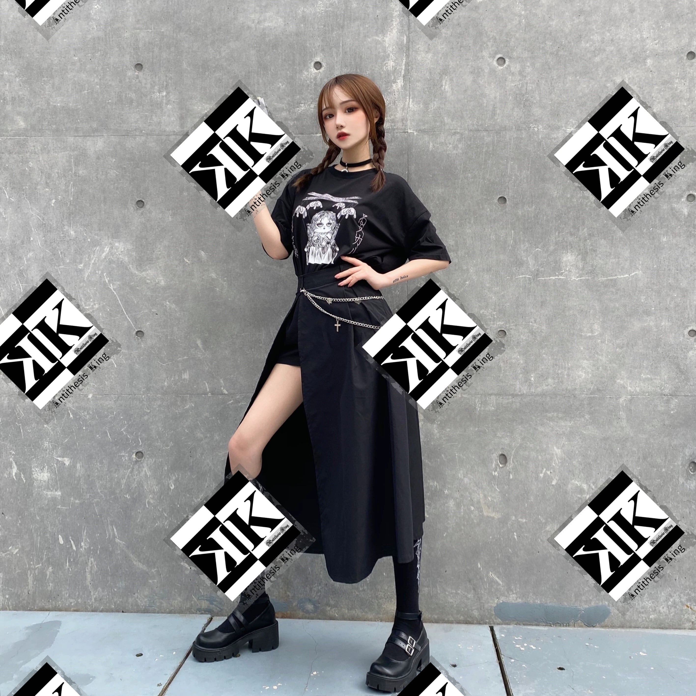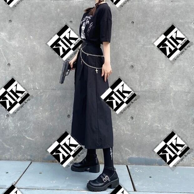 【ATK.LADY】B55 ハーフレングス ウォレットチェーン ミモレ丈 ハイスリット アシメ アシンメトリー 病みかわいい かっこかわいい かっこいい モード系 闇 レディース ロック 暗黒 韓国 原宿 クール スリット ロング スカート ダンス 演出 ストリート系