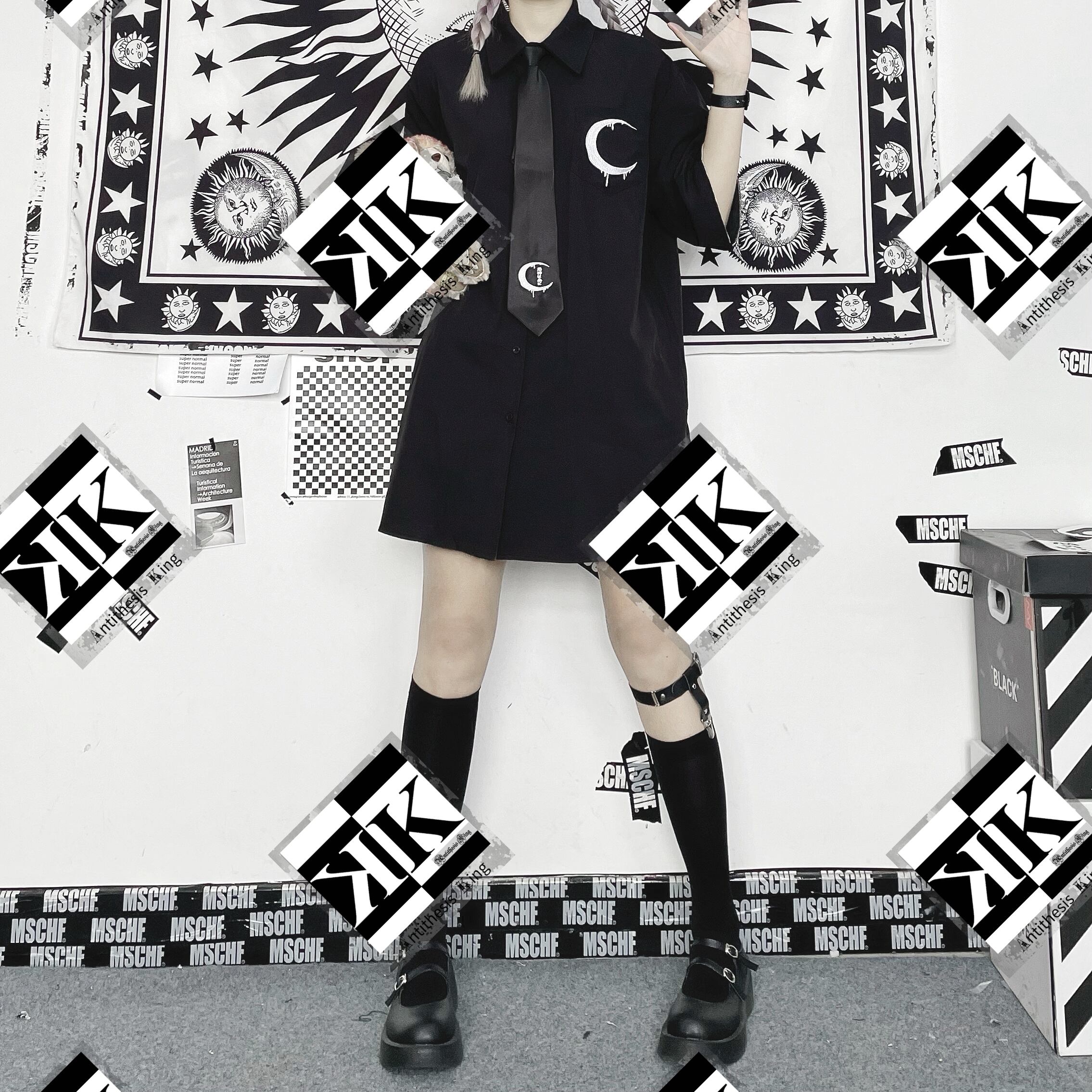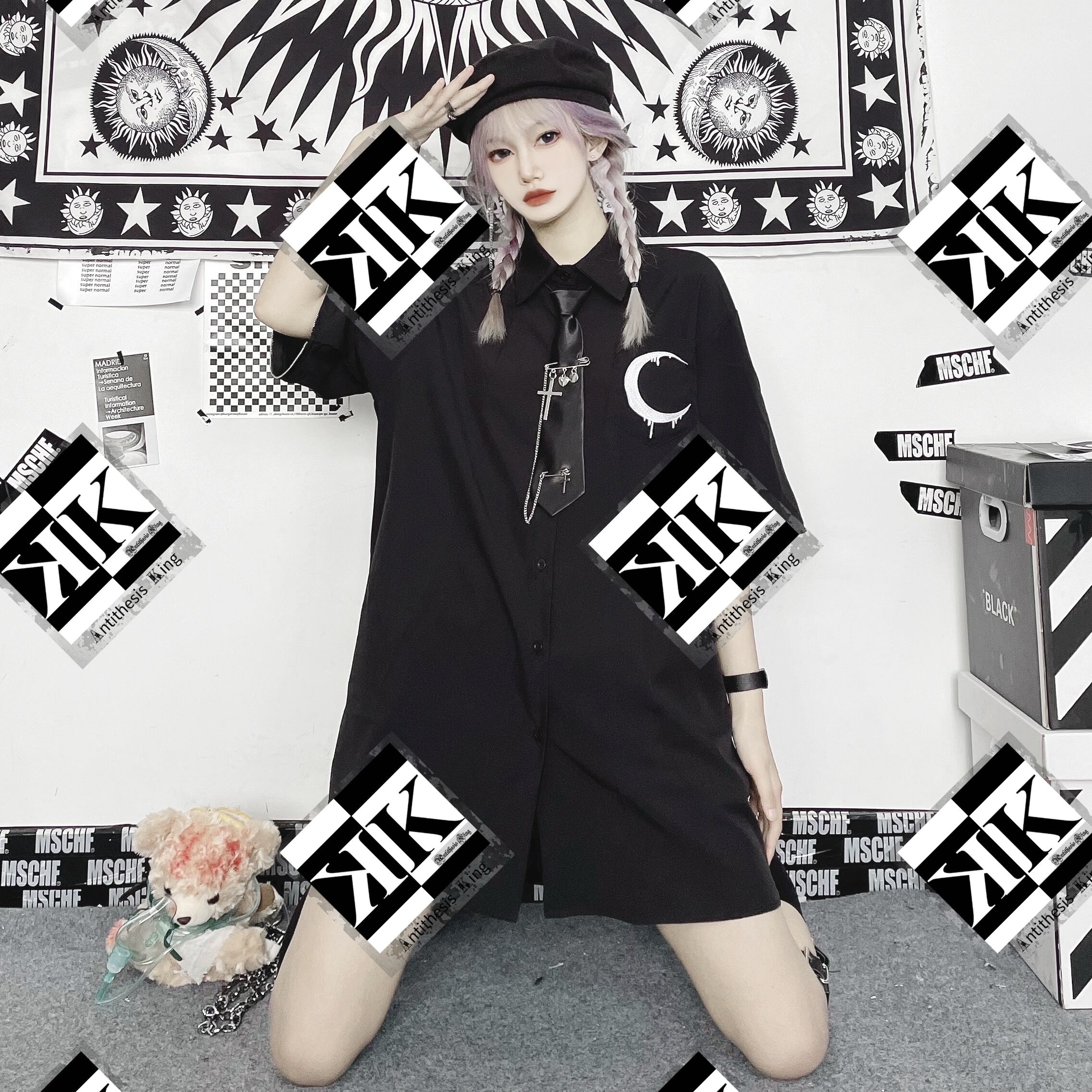 【ATK.LADY】C103 5分袖 かっこかわいい クールビューティ ワイシャツ 月 ムーン 闇 ブラック レディース 半袖 月 ロング シャツ ネクタイ 地雷 クール 暗黒 ダーク かっこかわいい