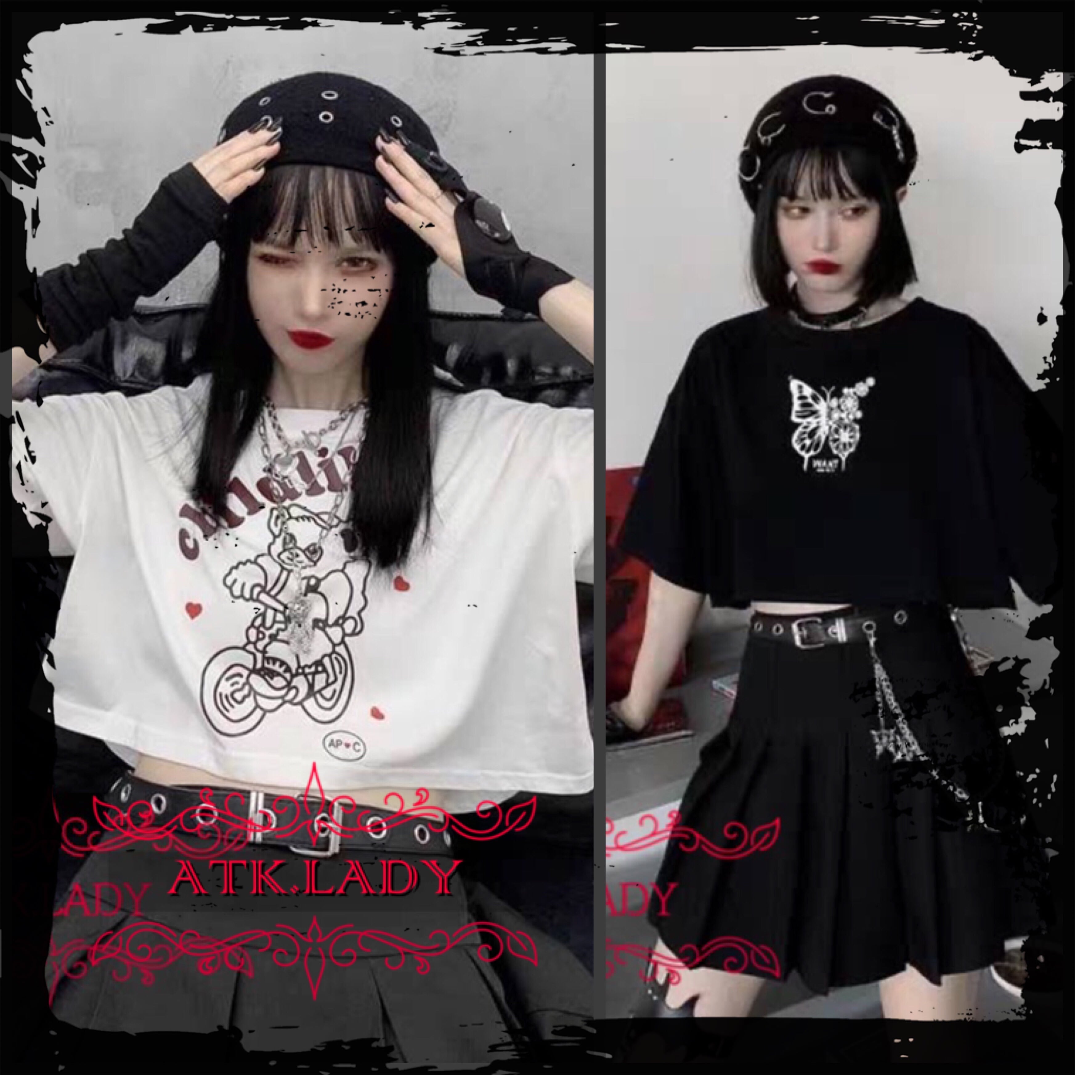 【ATK.LADY】A103 ブラック ホワイト へそ 白 黒 ステッチ 刺繍 バタフライ ショート丈 グリップトップ 短め ルーズ レディース 半袖 短め お腹 ダーク 蝶 熊 セクシー クール ダンス 演出 ストリート系 | 〜 Antithesis King 〜 レディースファション部門 (ATK.LADY)