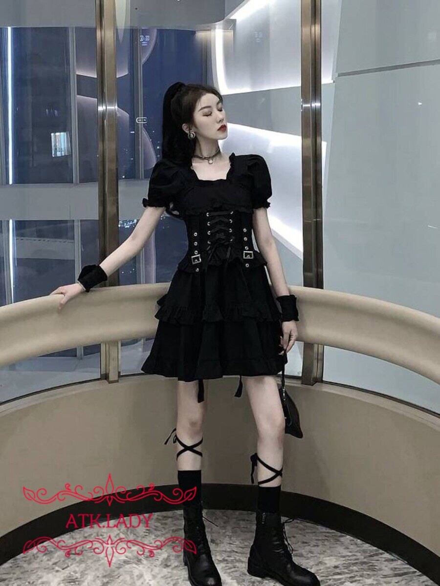 【ATK.LADY】D25 コルセット風 ウォレット ウエスト ベルト ランタンスリーブ Aライン 膝丈 黒魔術 ワンピース ゴシック ダーク 長袖 半袖 病みかわいい 暗黒 かっこかわいい リボン 病み フリル 闇 レディース | 〜 Antithesis King 〜 レディースファション部門 (ATK.LADY)