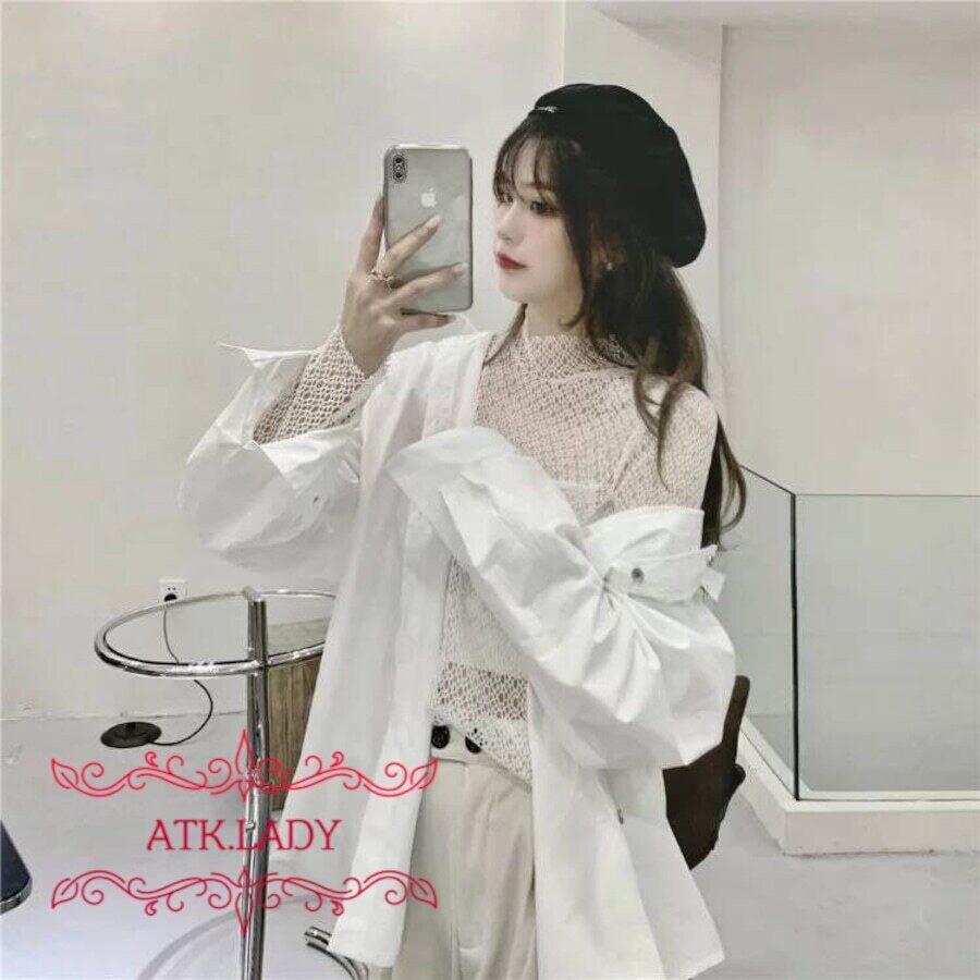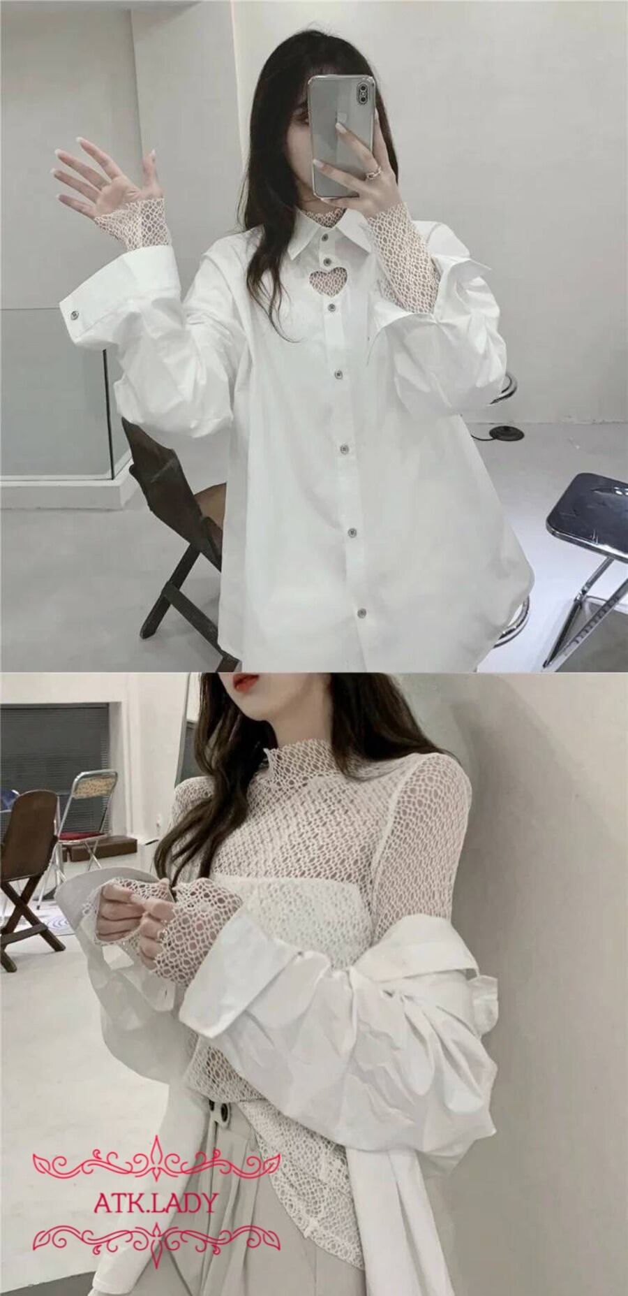 【ATK.LADY】N25 メッシュ ルーズ ホワイト カットアウト OL 大学生 通勤 通学 ハート 夏 着心地 爽やか 長袖 ワイシャツ 中性 純白 スモック レース 中性 乙女 白 レディース | 〜 Antithesis King 〜 レディースファション部門 (ATK.LADY)