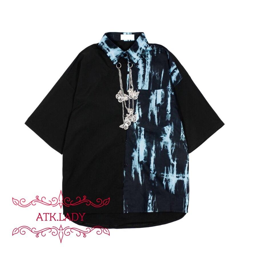 【ATK.LADY】E42 ストリート ユニセックス 中性 ビック big ルーズ 大きめ アシンメトリー アシメ 絞り染め 水色 スカイブルー 青 ブルー チェン ブルー シャツ ストリート 山本 中性 クール かっこかわいい 蝶 アシンメトリー | 〜 Antithesis King 〜 レディースファション部門 (ATK.LADY)