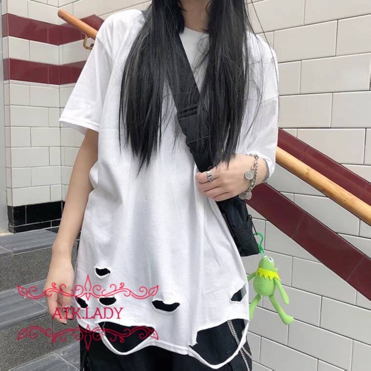 【ATK.LADY】E32 ストリート 黒 ブラック 白 ホワイト ビック big ルーズ ゆとり 変形ダメージ 不規則 破れ ダメージ 中性 ストリート レディース 重ね着 半袖 シャツ モノクロ | 〜 Antithesis King 〜 レディースファション部門 (ATK.LADY)