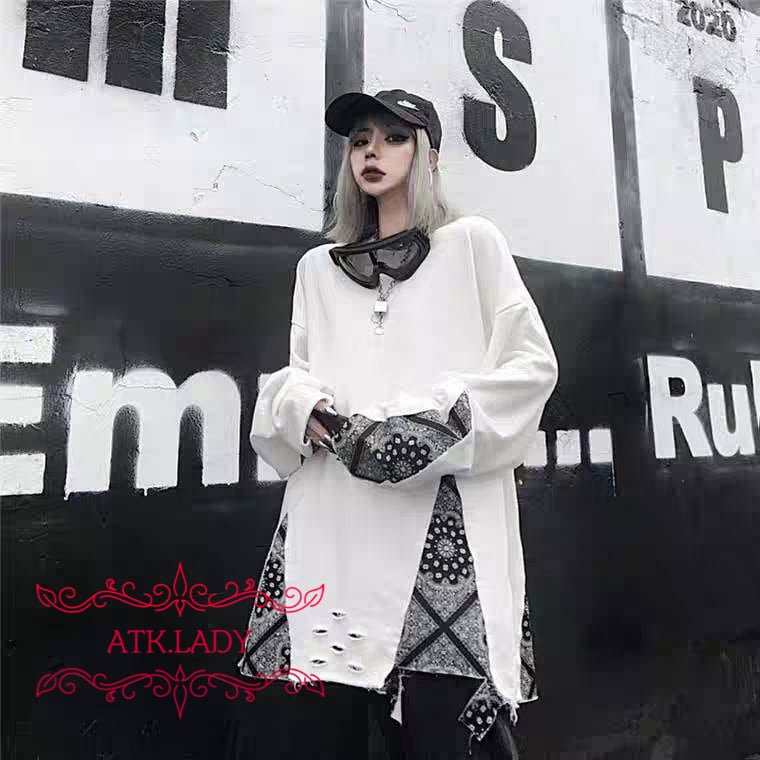 【ATK.LADY】D95 長袖 ユニセックス 変形裾 変則 ダメージ モード系 スリット アシンメトリー 黒 白 モノクロ Tシャツ レディース ヒップホップ | 〜 Antithesis King 〜 レディースファション部門 (ATK.LADY)