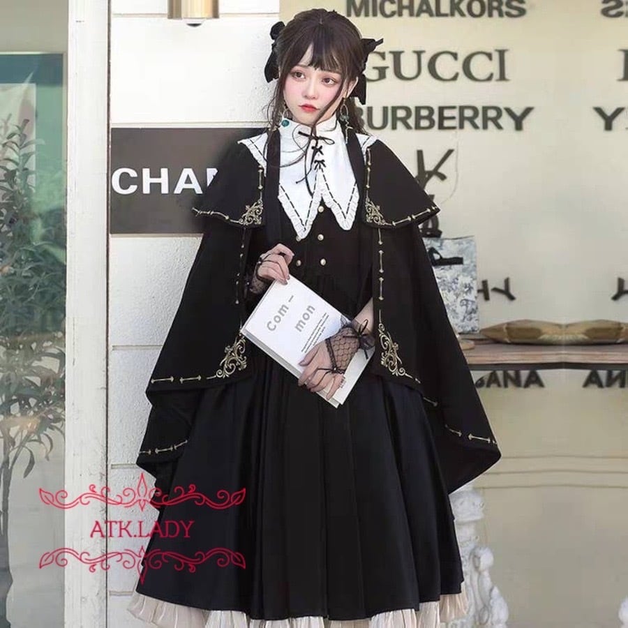 【ATK.LADY】K36 Holy studies Academy【聖学女院】欧米 aライン ヨーロッパ ケープ ダブル ビックカラー スカフ レースアップ タックフレア ボタン ショルダー 貴族 ドレス ゴスロリ ロリータ 痛い系 ワンピース プラック 黒 | 〜 Antithesis King 〜 レディースファション部門 (ATK.LADY)