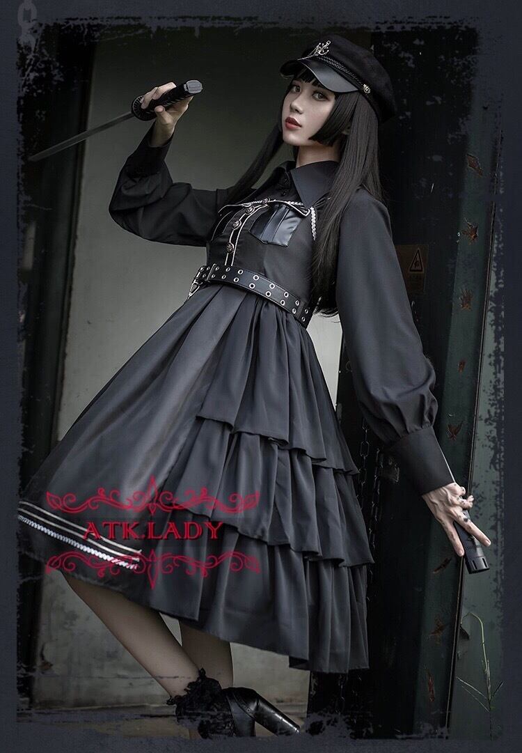 【ATK.LADY】A76 Jet black blade 【漆黒之刃】PSK 黒 ブラック タックフレア JSK キャミソールワンピース Aライン 革 貴族 軍ロリ クール かっこいい ミリタリー クラシカルロリータ クラロリ ドレス | 〜 Antithesis King 〜 レディースファション部門 (ATK.LADY)