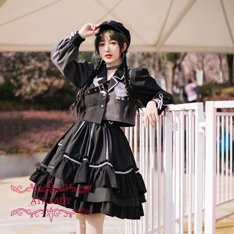【ATK.LADY】A86 Midnight sun rose 【白夜薔薇】ラップ ティアード 多層 セットアップ 黒 灰色 ブラック グレー バイカラー ダブルカラー ラップ 反射 光る アイドル 制服 コスプレ 舞台 ゴシック 軍ロリ ミリタリー ミリロリ アシメ アシンメトリー ワンピース ドレス | 〜 Antithesis King 〜 レディースファション部門 (ATK.LADY)
