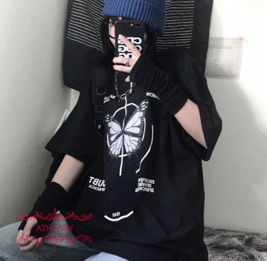 【ATK.LADY】M113 クール かっこかわいい 大きめ蝶プリント 白 バタフライ 夏 ヒップホップ ダンス着 黒 半袖 模様 絵柄 ビックサイズTシャツ レディース | 〜 Antithesis King 〜 レディースファション部門 (ATK.LADY)