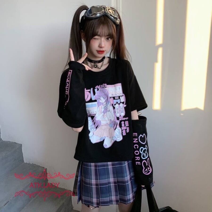 【ATK.LADY】M125 女の子 プリント 病み可愛い やみかわいい 個性 学生 黒白紫ブラックホワイトパープル 10代 20代 幼風 ロリータ 幼風 若者 ダンス 半袖 セパレートスリーブ 分離袖レディース 春 | 〜 Antithesis King 〜 レディースファション部門 (ATK.LADY)