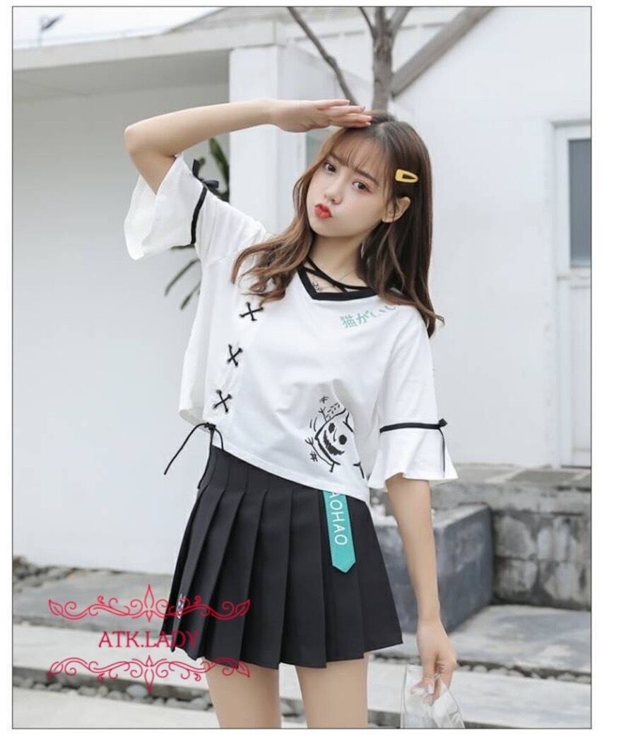 【ATK.LADY】N42 乙女 幼風 レースアップ 紐リボスリーブ 短め ショート丈 ネコ 白 半袖 華ロリー 夢かわいい ロリータ 中華風 レディース | 〜 Antithesis King 〜 レディースファション部門 (ATK.LADY)
