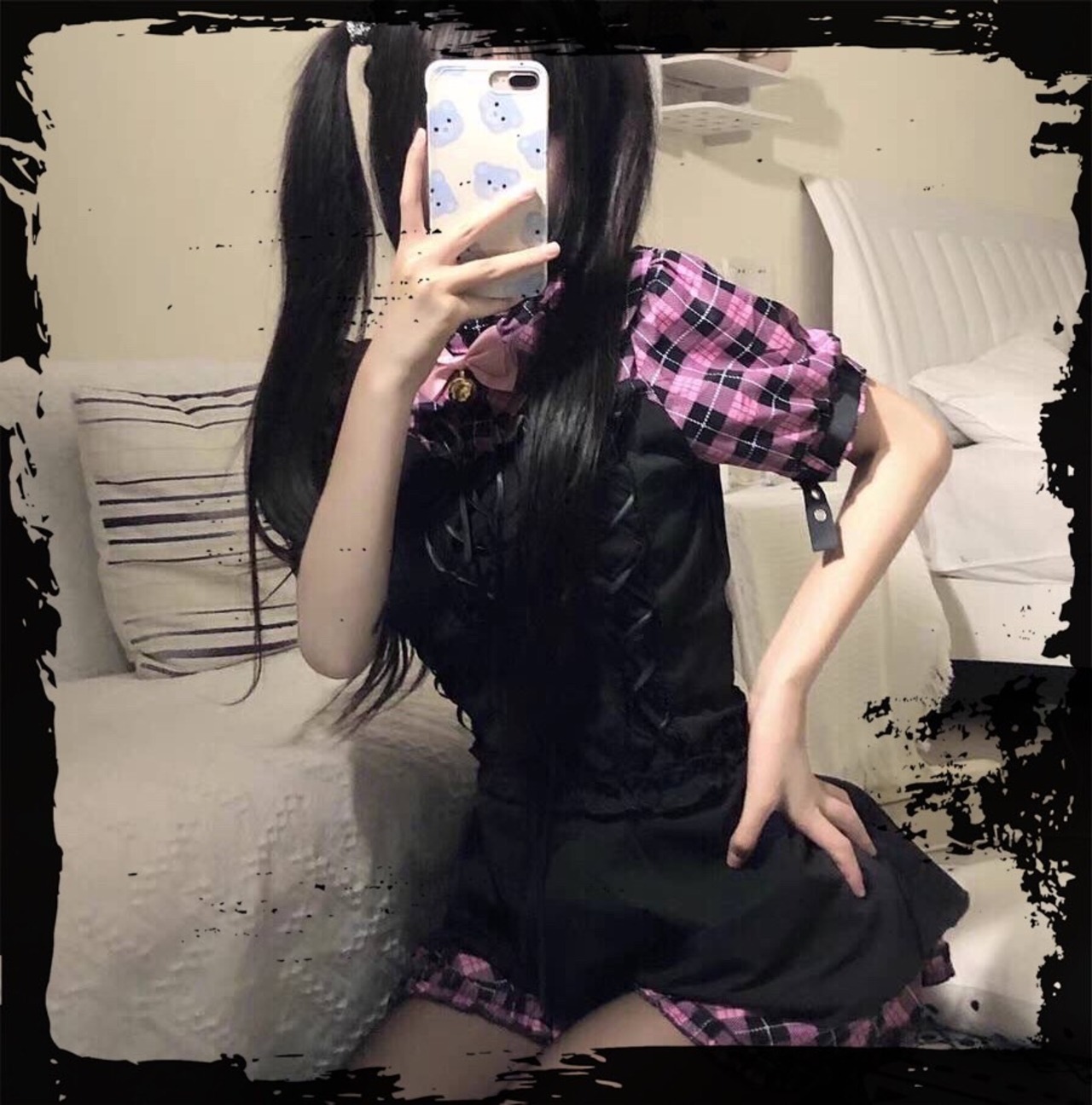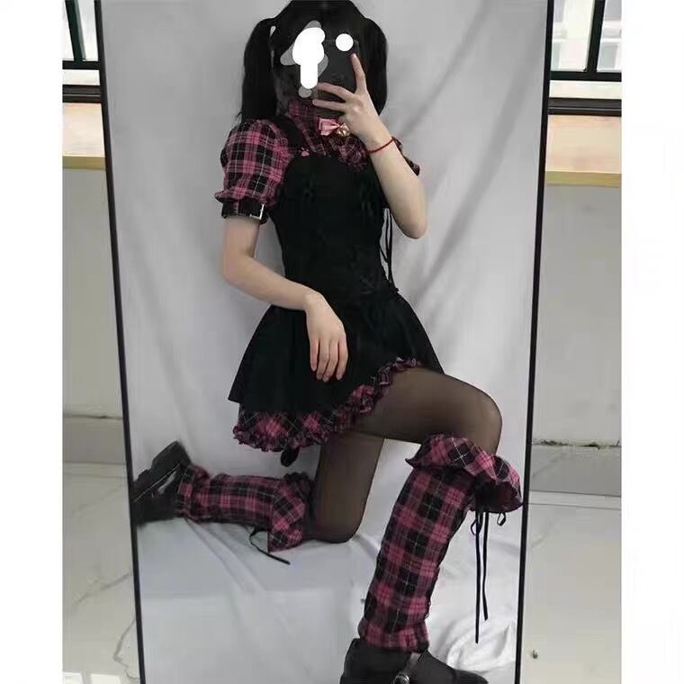 【ATK.LADY】K132 ダークチェック 細身 フェイク レディース ゴシック ピンク チェック ミニワンピース 重ね着 ベスト Aサイン ゴスロリ ゴシック 病みかわ リボン結び 量産系 レースアップ ロリータ | 〜 Antithesis King 〜 レディースファション部門 (ATK.LADY)
