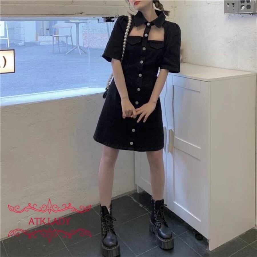 【ATK.LADY】N34 カットアウト デニム色 バストオプン ボタンワンピース くり抜き 個性 かっこいい クール デザイン 胸元 デニム シャツワンピース 青 ブルー 黒 ブラック レディース | 〜 Antithesis King 〜 レディースファション部門 (ATK.LADY)