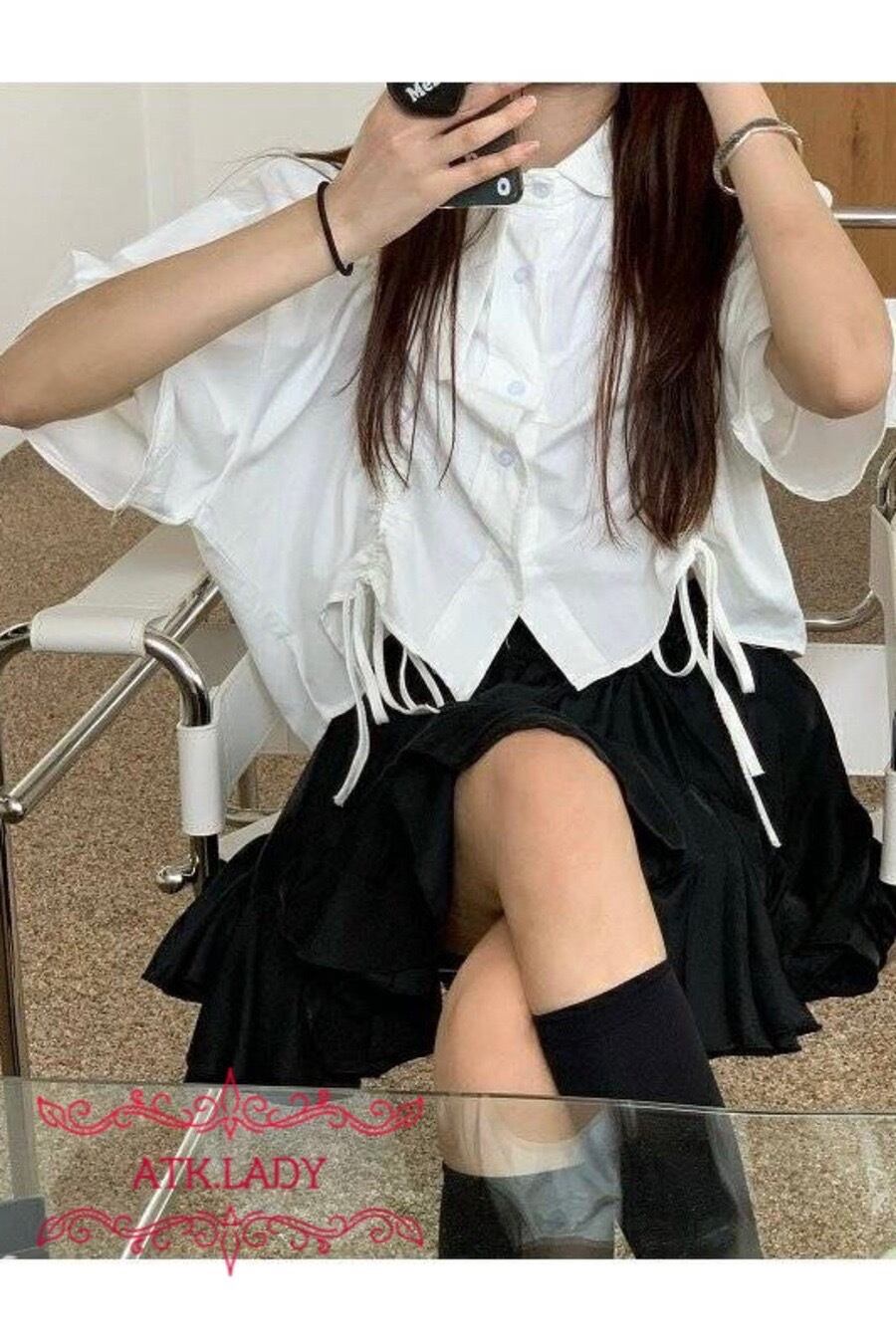 【ATK.LADY】N93 ドロスト 絞り紐 個性 カジュアル 乙女 デザイン リボン 半袖 シャツ レディース デザイン 大人かわいい キレイめ 五分袖 変形裾 不規則 | 〜 Antithesis King 〜 レディースファション部門 (ATK.LADY)