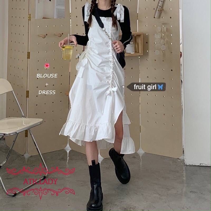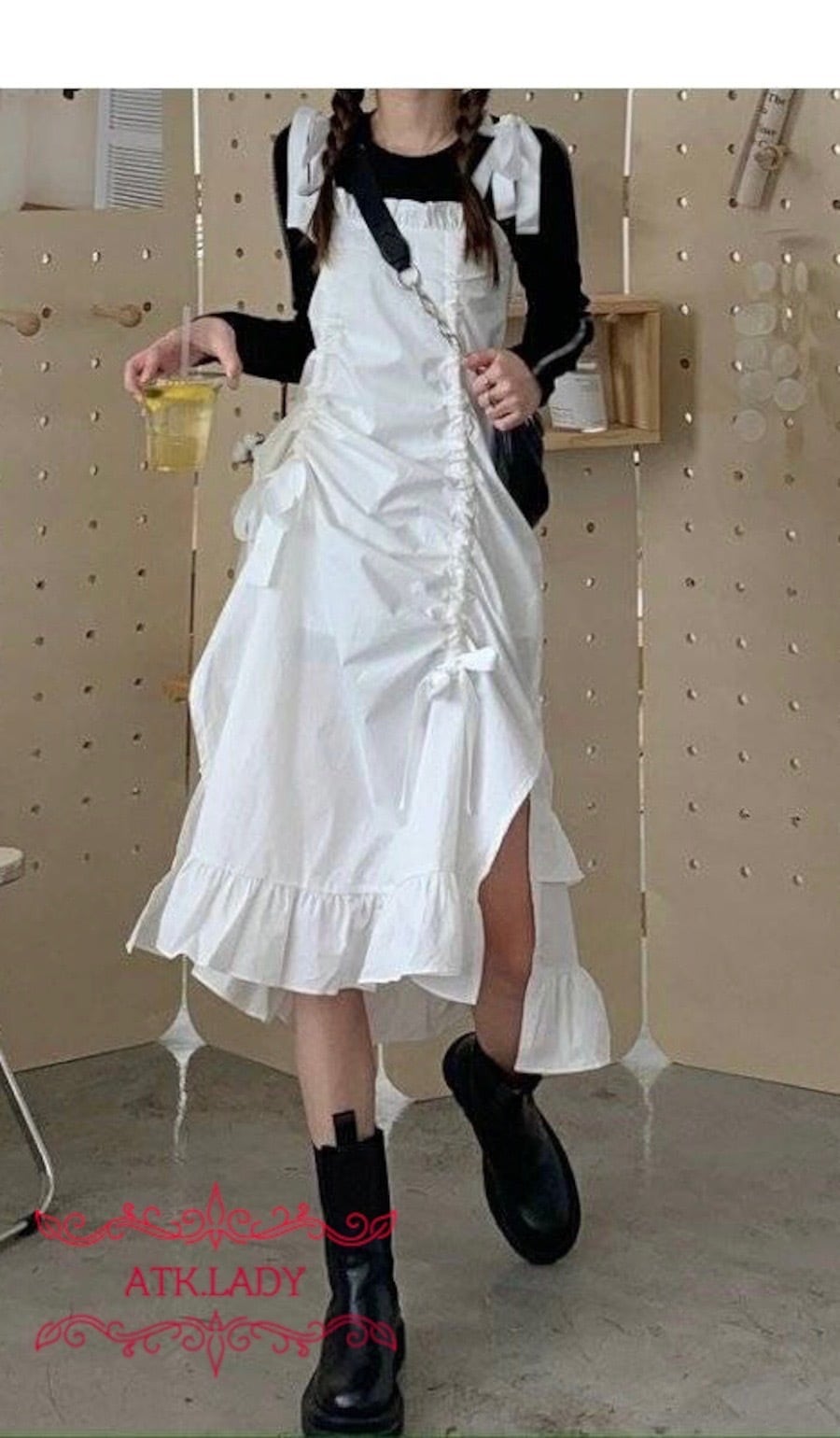 【ATK.LADY】N92 乙女 絞り紐 Aライン 細身効果 ドロスト スリット 肩紐 キャミソールワンピース デザイン 白 量産 ロリータ カジュアル しわ ヨレ ワンピース レディース | 〜 Antithesis King 〜 レディースファション部門 (ATK.LADY)
