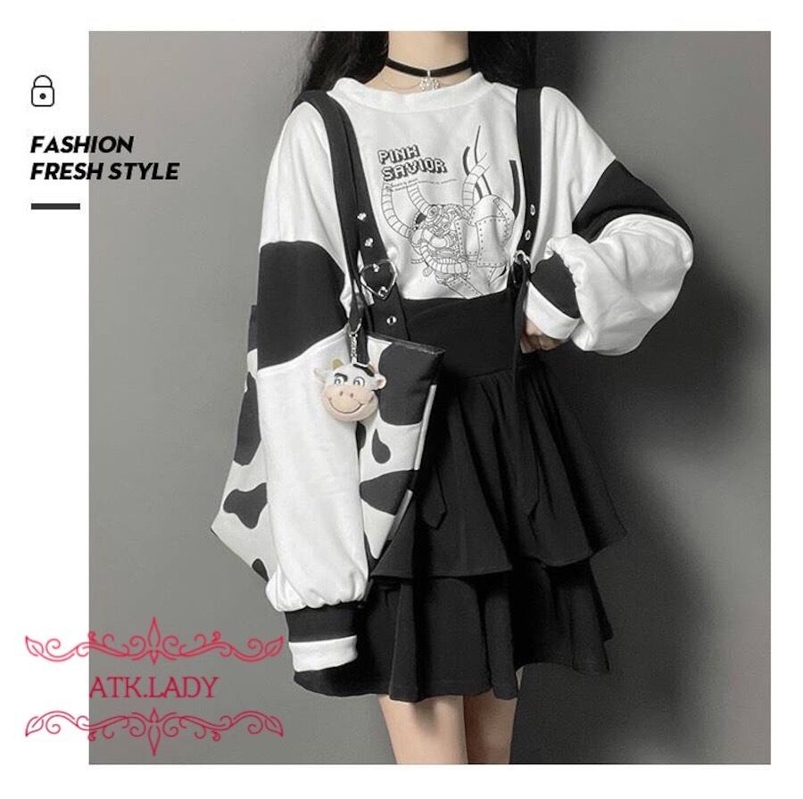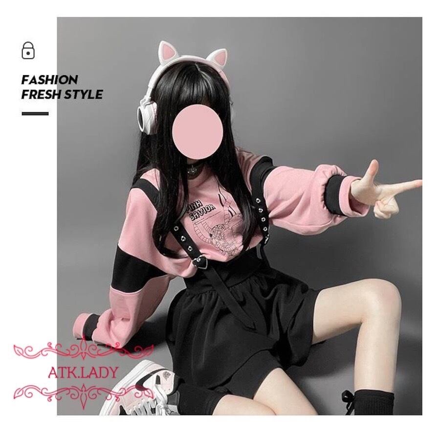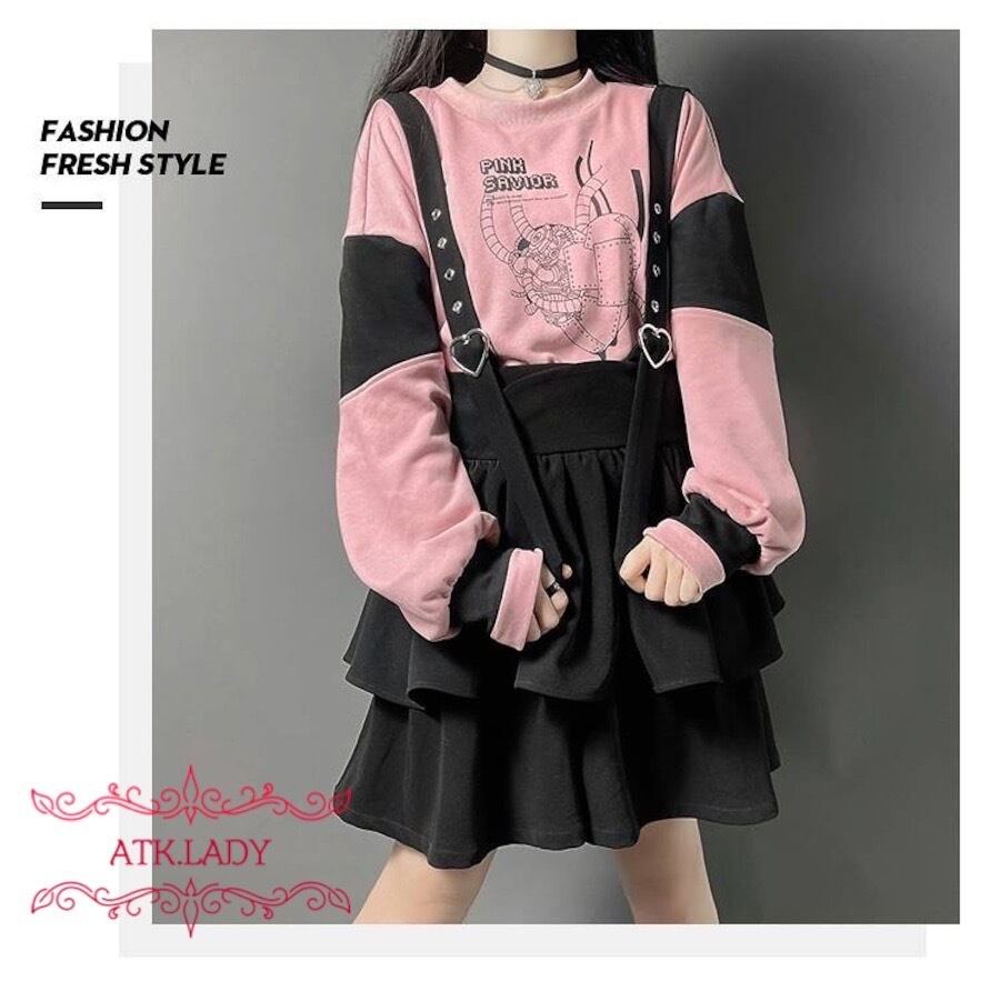 【ATK.LADY】N24 継ぎ接ぎ オーバーオール ハート 金具 2層 多層 ティアード ロリータ 量産 夢かわいい スカート プリント シャツ 長袖 白 ピンク パーカー レディース | 〜 Antithesis King 〜 レディースファション部門 (ATK.LADY)