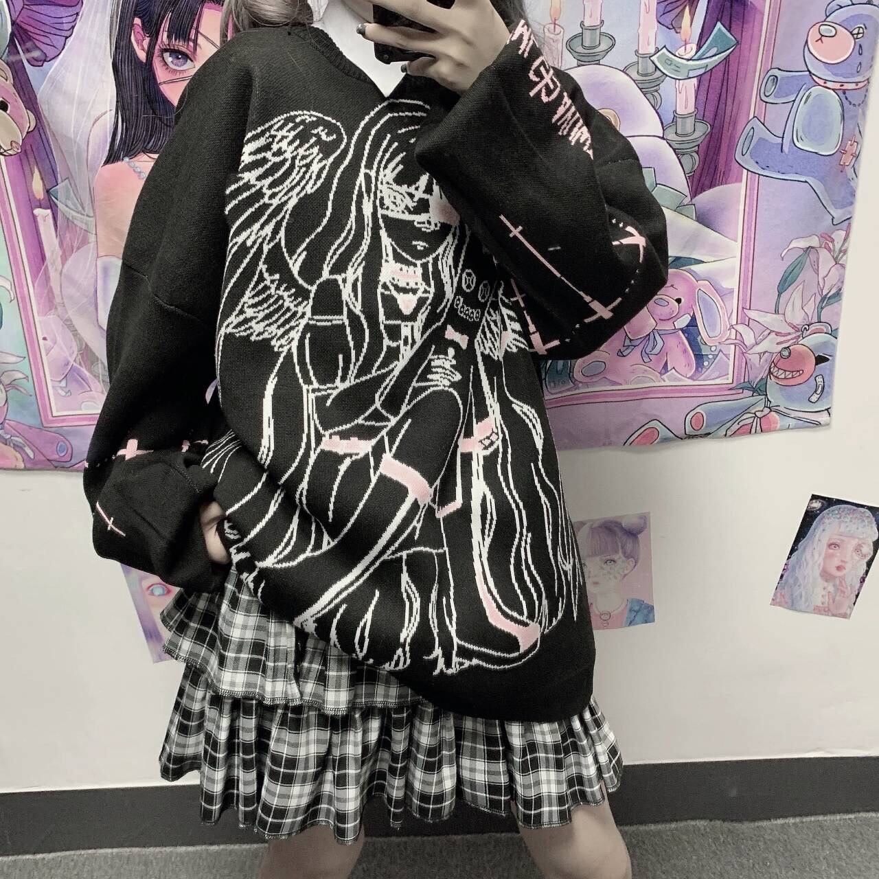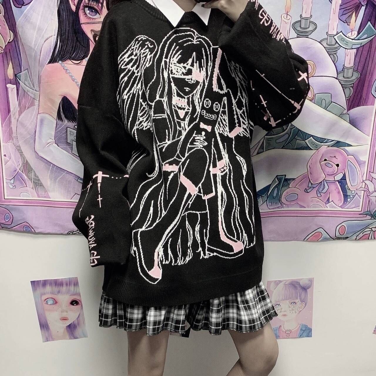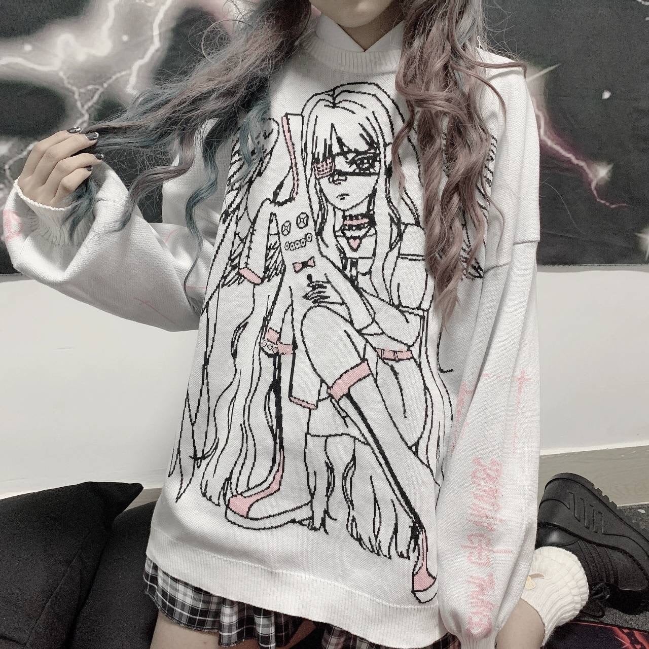 【ATK.LADY】M41 長袖 女の子模様 薄め パーカー風 ステッチ セーター プリント ワイド ブカブカ レディース ニット 病み かわいい 白 ホワイト ブラック 黒 絵 柄 やみ かわいい 地雷系 韓国 流行 学生 若者 | 〜 Antithesis King 〜 レディースファション部門 (ATK.LADY)