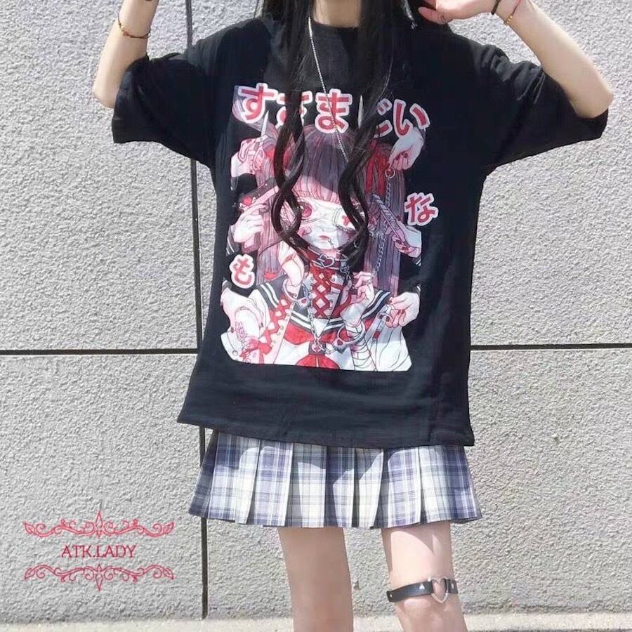 【ATK.LADY】K11 ワイド ルーズ カラー 闇かわい ロング プリント 女の子 レディース 半袖 シャツ 黒 ブラック 白 ホワイト 2D ロック ダーク 病み 病みかわいい 韓国 ダンス 演出 ストリート系 | 〜 Antithesis King 〜 レディースファション部門 (ATK.LADY)