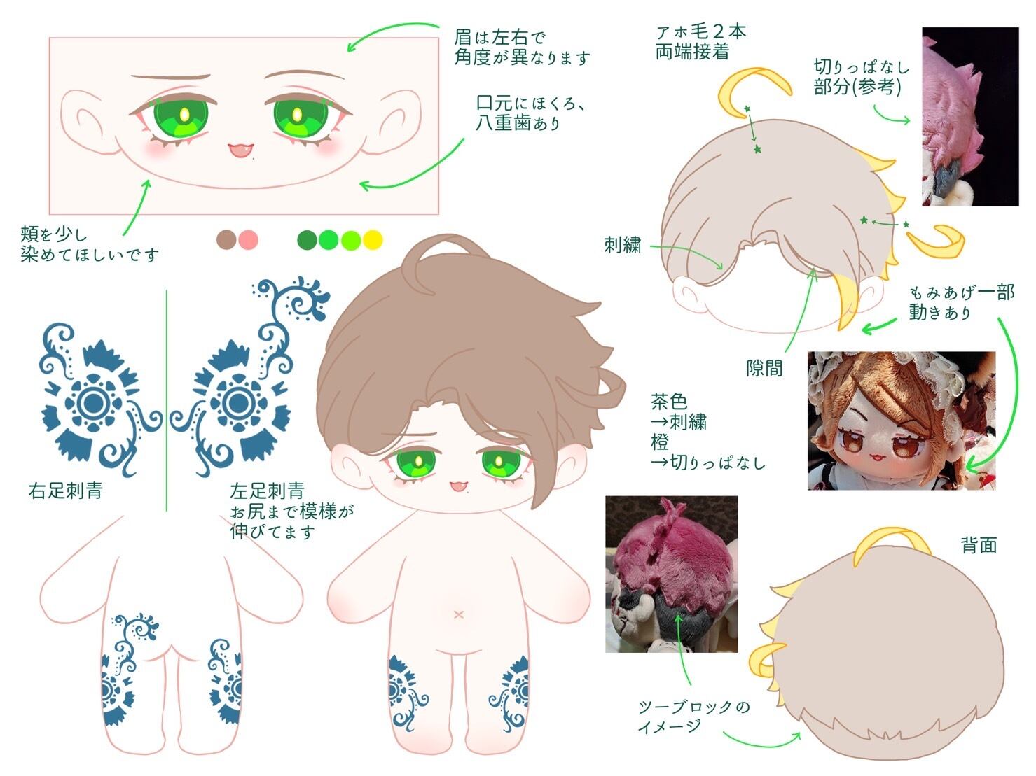 →口元にほくろ、両足にタトゥーの刺繍をお願いします。